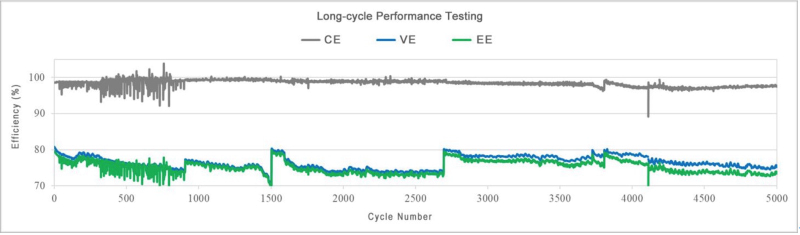 Long-cycle Test of 5000 Cycles for PBI Flow Battery Membrane: A 1kW stack operated at a constant current density of 240mA/cm², where the performance degradation caused by vanadium ion crossover can be restored to the initial state through electrolyte mixing.