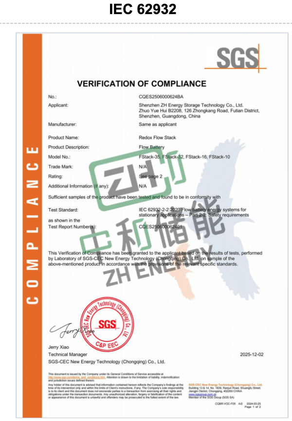 The stack is the core component of the flow battery energy storage system. It is the place where electrochemical reactions of the electrolyte occur to achieve charging and discharging, and it determines the power of the energy storage system. Because the flow battery stores the electrolyte outside the reaction stack, it has the characteristic of power-capacity decoupling: the stack determines the power of the battery, and the amount of electrolyte determines the capacity of the battery. Relying on the founder's more than ten years of industrialization experience in the American flow battery industry, ZH Energy has developed and produced stacks with an internationally leading level, providing strong technical support for the product to achieve a stable and efficient operation with a service life of 20 years. The stack product has obtained UL 1973 and IEC 62932 certificates, meeting the grid-connection requirements for most countries worldwide.